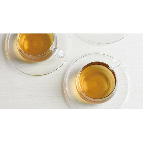 ソーサーがセットになったガラス製のティーカップで、茶葉から抽出された自然の彩りを楽しんでみませんか? 色を楽しめるクリアガラス 日の光に透かされたドリンクの、優しい揺らぎに心落ち着けるひと時を。