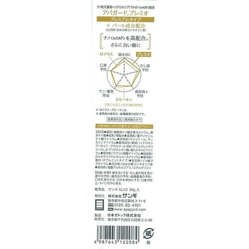 【販売名】サンギXLC2【効能 効果】・歯を白くする・むし歯の発生及び進行の予防・歯肉炎の予防・歯槽膿漏の予防・口中を浄化する・口中を爽快にする・口臭の防止・タパコのやに除去【用法 用量】・歯ブラシに適量(1cm程度)をつけて、薬用成分が作用するよう、よくブラッシングして下さい。